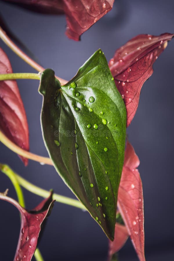 - Description: Syngonium erythrophyllum 'Red Arrow' is an evergreen climber from the aroid family, Araceae. It's commonly grown as a houseplant for its attractive foliage. Keep it moist in the growing period but allow to dry out a little in between watering during the winter. Keep in medium to bright light, out of direct sunlight. It produces vibrant light green, arrow-shaped young leaves with vibrant purple undersides. The leaves develop into a completely different structure with age. Mature leaves are divided into 3 lobes or 5–9 distinct leaflets and these do not closely resemble the young arrow-shaped leaves.
